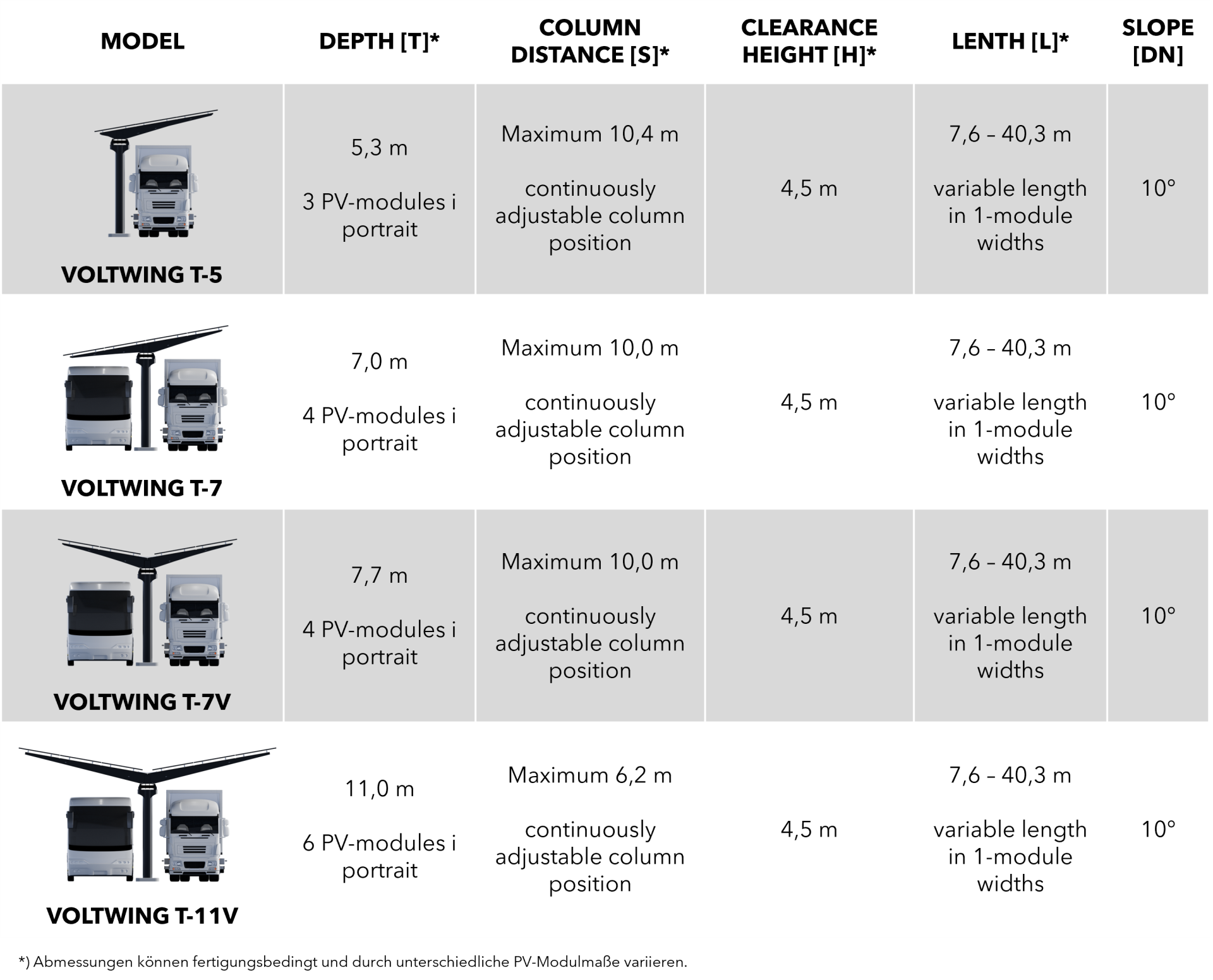 Whether single-row or double-row parking spaces, cars or delivery vans, standard or disabled parking spaces. Almost every conceivable application can be covered with the VOLTWINGS modular system. Four different roof shapes, a variable length between 8 and 35 m and infinitely adjustable columns make it possible.