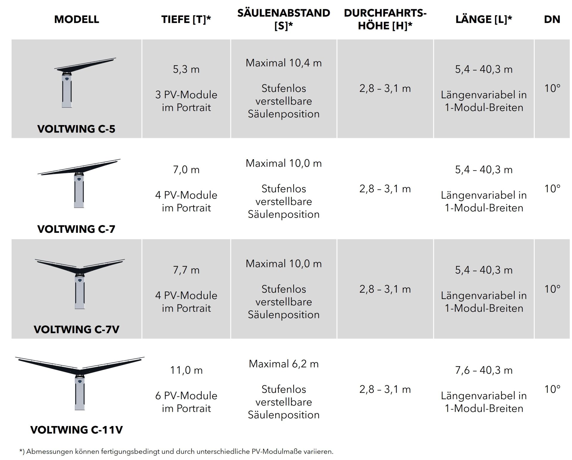 Egal ob einreihige und zweireihige Parkplätze, PKW oder Lieferwagen, Standard- oder Behindertenparkplätze. Fast jeder erdenkliche Anwendungsfall kann mit dem VOLTWING Modularbaukasten überdacht werden. Vier verschiedene Dachformen, eine variable Länge zwischen 6 und 35m und stufenlos verstellbare Säulen machen’s möglich.