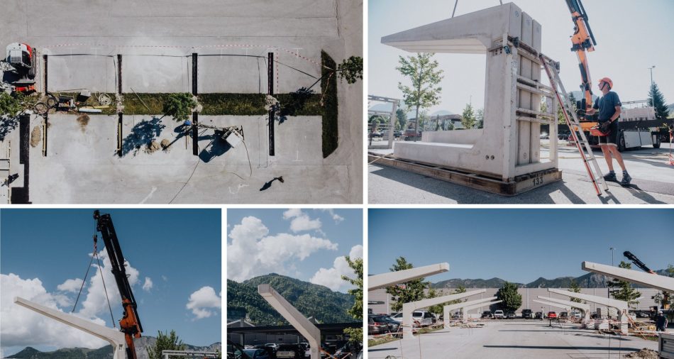 Projektablauf: Zuerst werden schmale Streifen in den Asphalt geschnitten und ausgehoben. Anschließend werden die Beton-Fertigteile - die ohne Sondertransport angeliefert werden - auf die Baustelle gebracht und mit dem Ladekran verhoben. Über das spezielle Bernegger Bodenverankerungssystem werden die Fertigteile positioniert und anschließend vergossen. Nach der Fertigstellung der Säulen beginnt der Aufbau mit dem VOLTRAIL-Dachsystem.